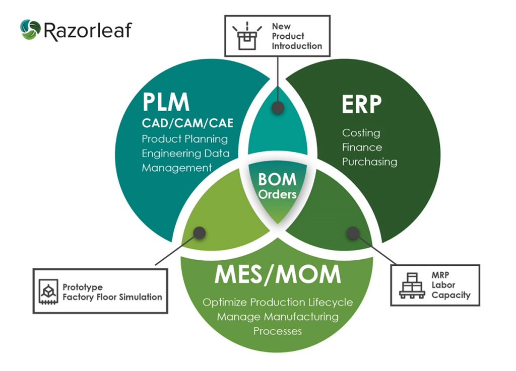 PLM manages CAD/CAM/CAE product innovation and the simulation of production process plans in the earliest stages of design. By connecting the disciplines of ERP, MES and MOM with design, PLM allows manufacturers to adapt to unexpected supply chain pressures more quickly and effectively. Image courtesy of Razorleaf